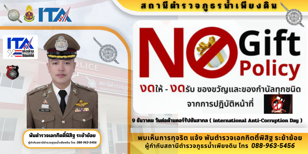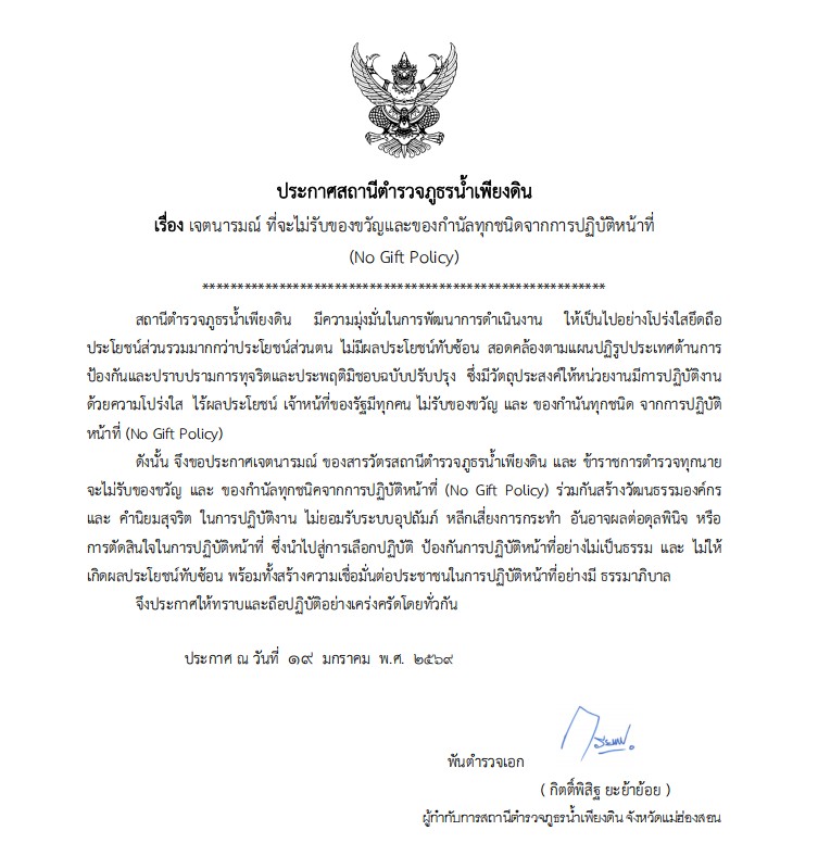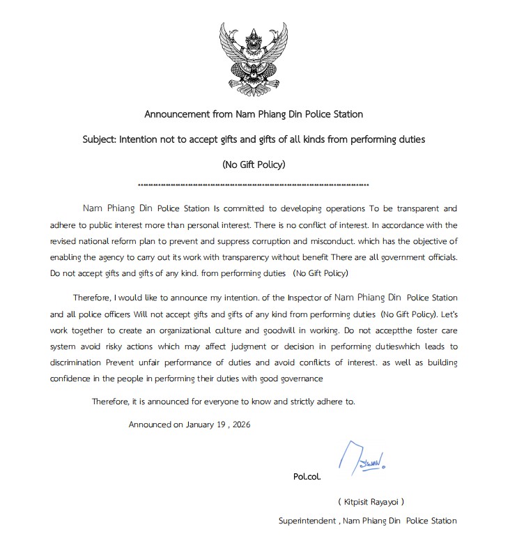 - ประกาศสำนักงานยุทธศาสตร์ตำรวจเรื่องเจตนารมณ์ที่จะไม่รับของขวัญหรือของกำนัลทุกชนิดจากการปฏิบัติหน้าที่