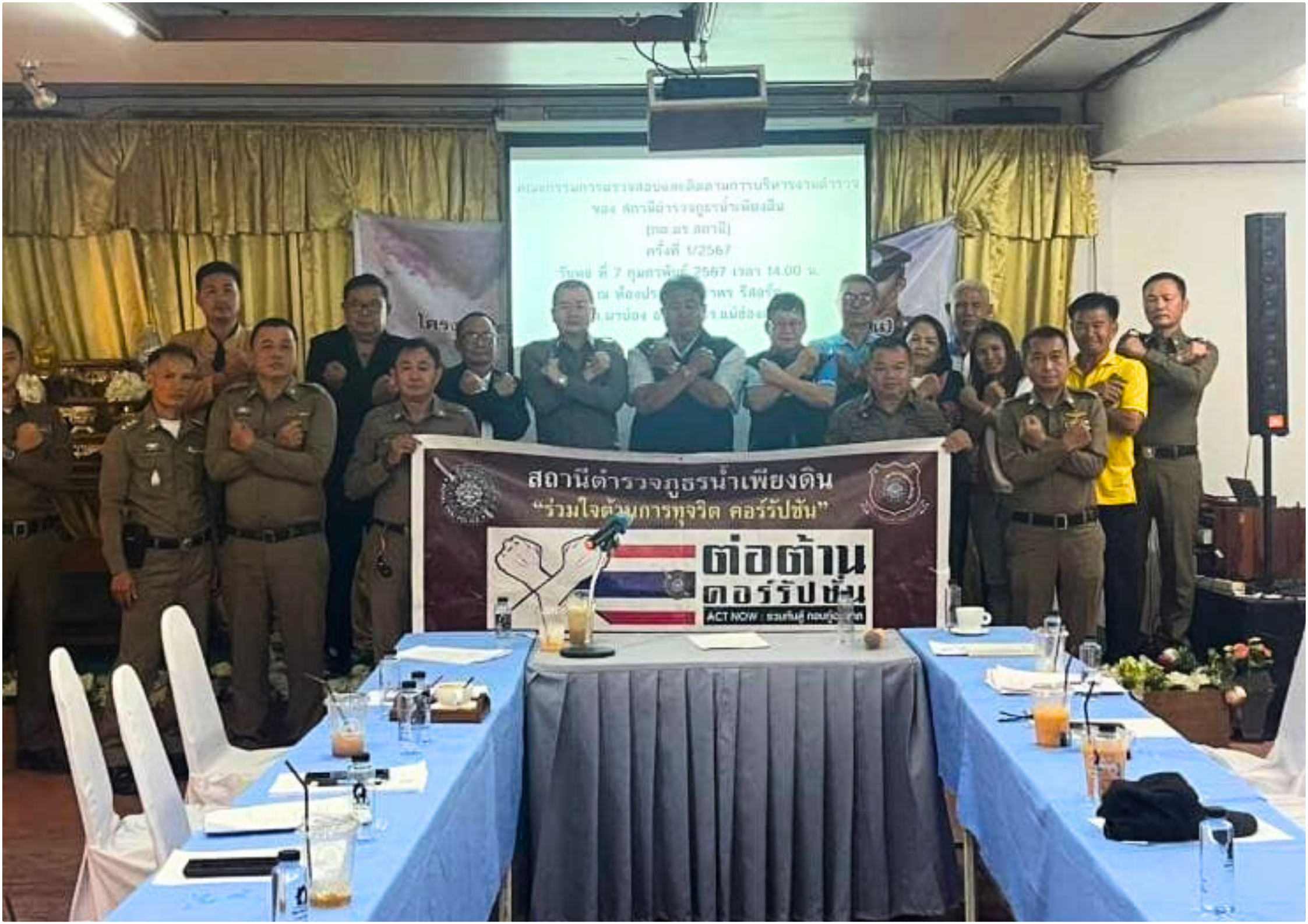 โดยที่ประชุมได้มีการปรึกษาหารือปัญหาด้านต่างๆ ตลอดจนเสนอแนะ แนวทางการปฏิบัติหน้าที่ของ จนท.ตำรวจ สภ.น้ำเพียงดิน เพื่อให้บริการประชาชนและดูแลความสงบเรียบร้อยในพื้นที่รับผิดชอบอย่างมีประสิทธิภาพต่อไปและได้ร่วมกิจกรรมประกาศเจตนารมย์แสดงจุดยืนต่อต้านการทุจริตคอร์รัปชั่นร่วมกัน