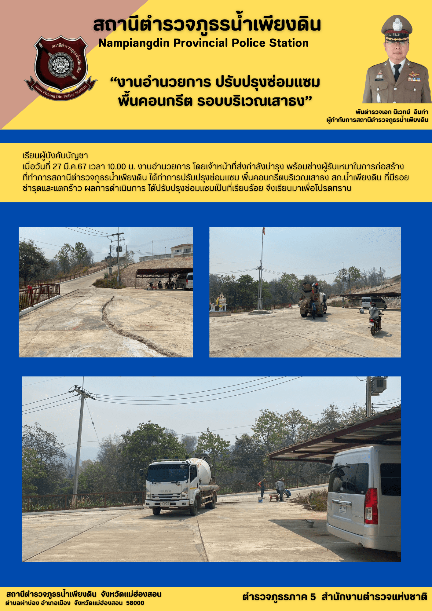 เมื่อวันที่ 4 มี.ค.67 เวลา 08.30 – 16.30 น. งานอำนวยการ สภ.น้ำเพียงดิน ประกอบด้วย พ.ต.ท.นันทพั